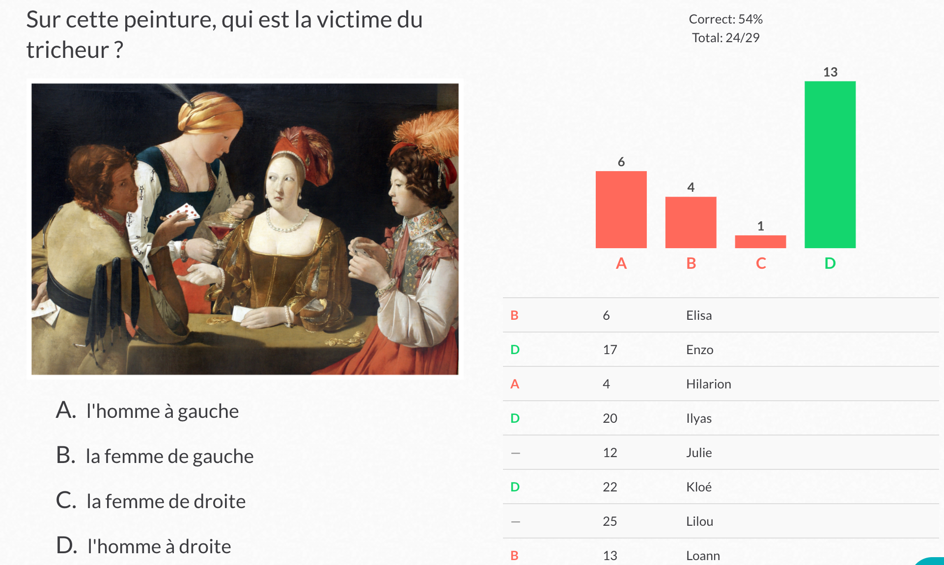 Je vous rappelle le principe très rapidement : les élèves se voient attribuer une carte qui contient un symbole. En fonction de l’orientation de ce symbole, l’élève va choisir entre 4 réponses possibles : A B C ou D. A l’aide d’un smartphone ou d’une tablette, l’enseignant va scanner les cartes des élèves et tous les résultats s’affichent en direct sur le site via le web.