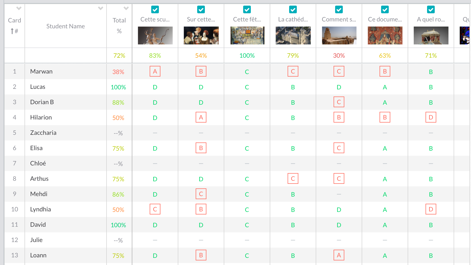 Enfin, et c’est la cerise sur le gâteau, une page affiche un récapitulatif final de toute la classe. On peut alors voir le pourcentage de bonnes réponses par élève et savoir précisément où la ou les erreurs ont été commises.