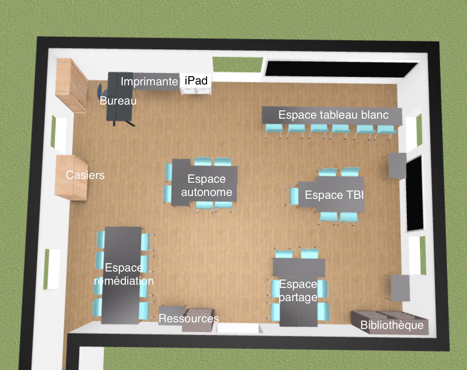 J’ai donc pu imaginer des pôles. L’espace tableau blanc, l’espace TBI, l’espace partage de connaissance, l’espace autonomie et l’espace de remédiation. Pas besoin de détailler ces pôles, les dénominations sont assez explicites.