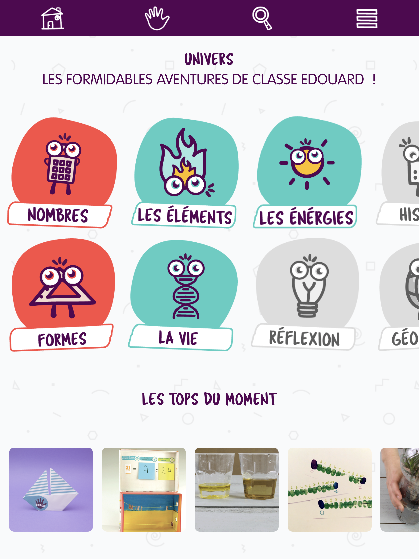 – Sélectionnez un univers à explorer : Les Formes, les Nombres, les Éléments, la vie et de nombreux autres !