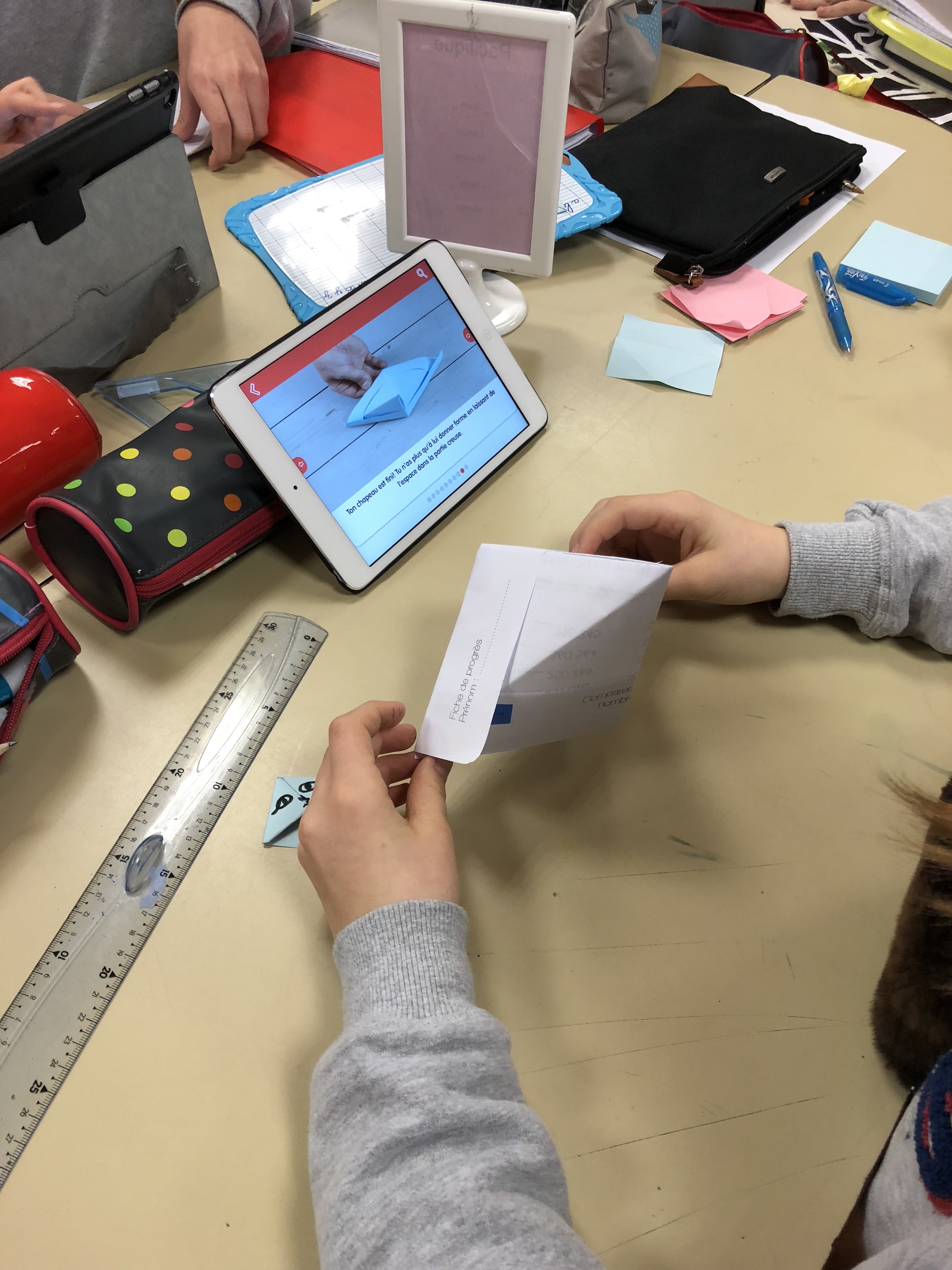 Travaillant en atelier, mes élèves étaient en autonomie (ma classe est disposée en 6 îlots de 5 élèves). Et je peux vous dire qu’ils ont adoré. Pour eux, c’est s’amuser; pour moi, c’est faire de la géométrie sans s’en rendre compte..