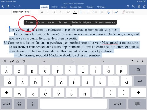 Je vérifie ensuite dans les réglages de l’iPad (général-accessibilité) que la fonction parole (énoncer) est activée. Puis je sélectionne tout le texte ou une partie, je choisis « énoncer » dans le menu et c’est parti. Sachez qu’il est possible de régler la vitesse de lecture. Tout n’est pas parfait, la voix est « robotique », les liaisons ne sont pas faites mais les mots sont correctement prononcés.