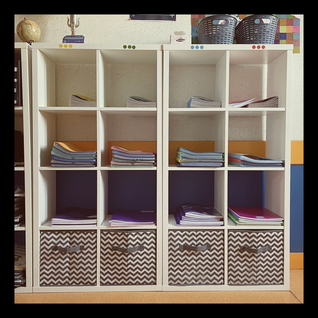 Si on veut qu’une classe flexible fonctionne correctement, il faut essayer de ne pas utiliser les casiers qui sont sous les tables. J’ai longtemps fonctionné avec un meuble à 30 cases où chaque élève avait sa place, mais ce n’était pas si satisfaisant que cela.