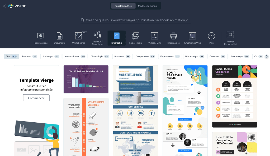 La force de ces deux logiciels est le nombre de modèles qu’ils proposent. Vous retrouvez sur les deux plateformes plus ou moins les mêmes modèles mais Canva en contient beaucoup plus que Visme. Malgré tout, vous trouverez largement votre compte sur l’un ou sur l’autre.